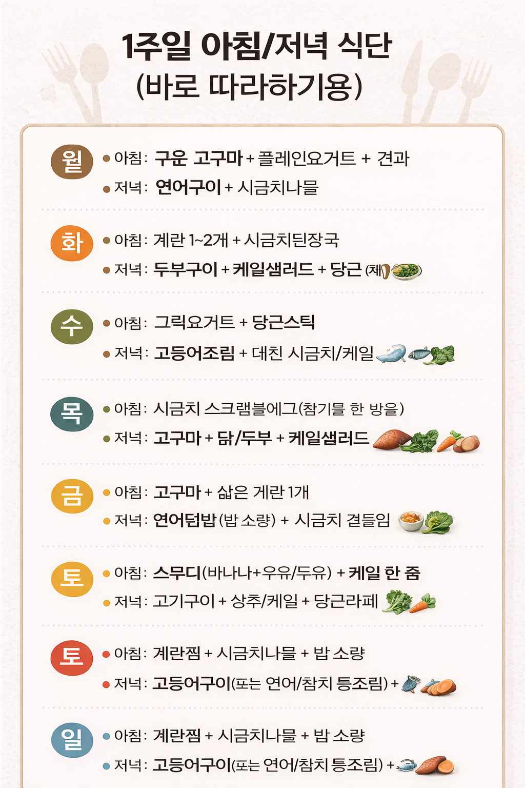 1주일 식단 예시(아침/저녁): 바로 따라하기용